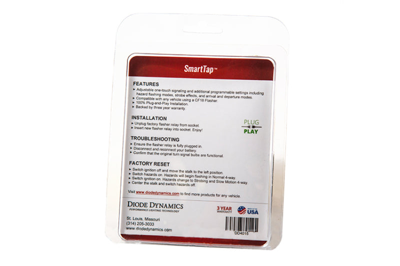 Features Adds unique, programmable functions Compatible with LED or standard bulbs, no hyperflash Plug and play swap for original module Assembled in USA, 3 year warranty A Smarter Flasher The SmartTap™ is a replacement turn signal flasher relay, compatible with any vehicle using a CF18 (LM449) Flasher. With plug-and-play installation, it offers a lot more than your average relay: an embedded microcontroller is loaded with exclusive software, which adds new features to your vehicle! You can program the features just the way you'd like, with the help of the included programming guide. Tap-to-Signal: Anytime the turn signal is tapped, the turn signal will blink a number of times automatically. This one-touch signaling is a convenient way to signal other drivers when switching lanes. The number blinks is programmable, to make it as long or short as you'd like. Unique Hazard Functions: The SmartTap™ has built-in strobe, slo-mo and wig-wag hazard functions to help your vehicle stand out when the hazards are on. Apply these functions on their own, together, or with the strobe setting for a total of eight unique hazard functions! Arrival and Departure Modes: When the lock or unlock button is pressed, your turn signals will stay on in a steady glow, for better visibility when approaching or leaving the vehicle at night. The lighting time can be adjusted from 10-90 seconds for additional illumination, or disabled if desired. This product was designed, programmed, and assembled by Diode Dynamics, in St. Louis, Missouri, USA.